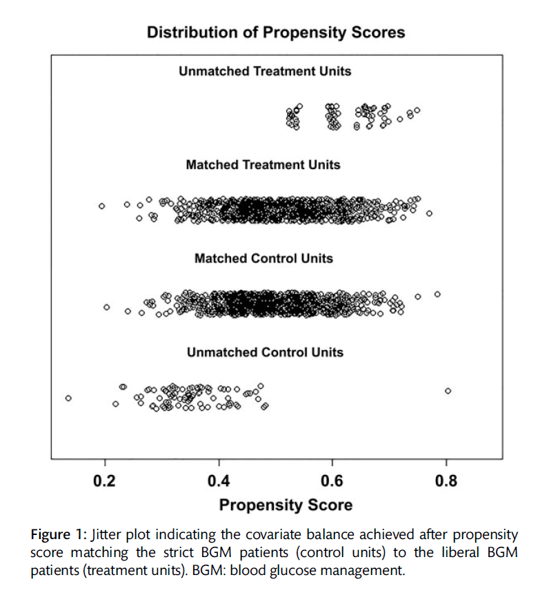 Methods: BGM was changed in June 2011 from strict (90–110 mg/dl) to liberal (120–180 mg/dl). Insulin drips, managed through a computerized algorithm, controlled BG for the first 72 h post surgery. Consecutive cardiac surgery patients operated on throughout 1 year prior to BGM change (n = 934) were propensity score matched to patients operated on throughout 1 year after the change (n = 927).