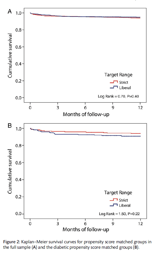 Of importance, we performed the same analysis using PSM for the patients who presented to surgery with diabetic mellitus, using the STS definitions. The results of this subgroup analysis demonstrated the same trends. We find these results very important, as the more liberal range of glycaemic control in this subgroup of patients seems to be associated with the same perioperative outcomes and 1-year survival. These results seem different from the results published by Ingels et al. [6], suggesting that a strict BG control (80–110 mg/dl) is associated with better survival and quality of life. However, in that particular study, the strict protocol was compared only with a treatment regimen that included intermittent intravenous insulin when BG levels were found higher than 220 mg/dl.
